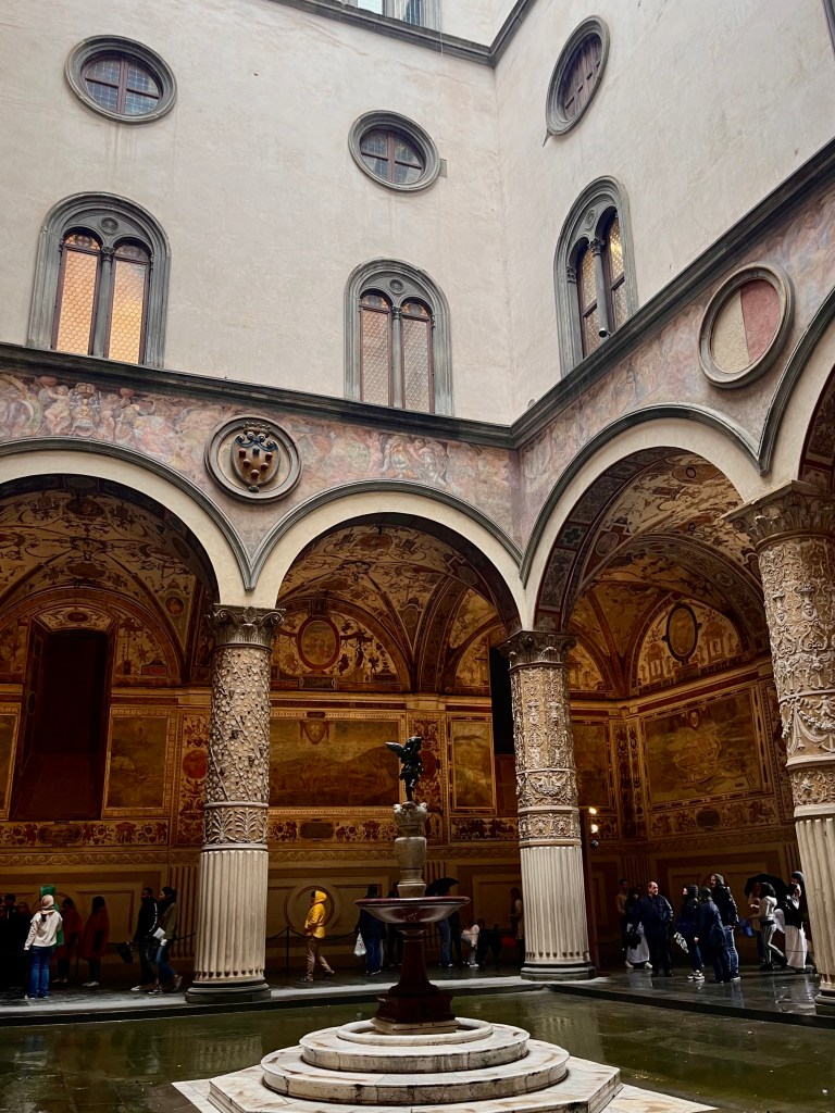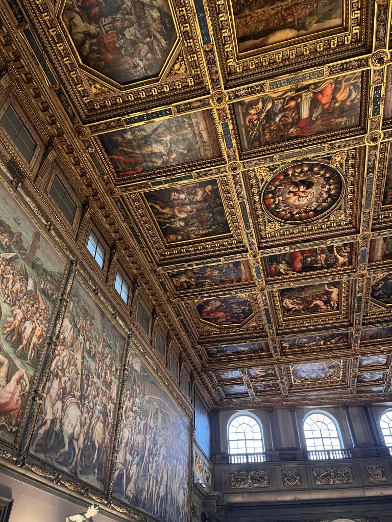 Direction Piazza della Signoria pour cette deuxième journée florentine ! Bon, encore un temps capricieux (merci les nuages 😒), alors on a opté pour une visite 100 % historique au Palazzo Vecchio. Et franchement ? AUCUN REGRET. Ce bâtiment, c’est du costaud : une immense forteresse en pierre avec une tour qui domine la ville. Autrefois, c’était le QG du pouvoir à Florence, et tu ressens direct son importance dès que tu franchis les portes.On a adoré en apprendre plus sur les coulisses de Florence à travers les siècles. Parce que oui, derrière ses palais et ses œuvres d’art, la ville a été le théâtre de combats de pouvoir, notamment entre les célèbres Médicis et d’autres grandes familles. Chaque salle est une claque visuelle : fresques grandioses, dorures, plafonds sculptés… Mention spéciale pour le Salone dei Cinquecento (première photo du carousel en haut à droite).