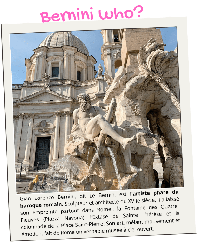Après ce gros morceau, moment balade : On se dirige ensuite vers la somptueuse Piazza Cavour pour après se rediriger vers le centre, plus précisément à la Piazza Navona dont l’éclatante blancheur et sa Fontaine principale (des Quatres Fleuves) sculptée par le Bernin*, nous a émerveillé.