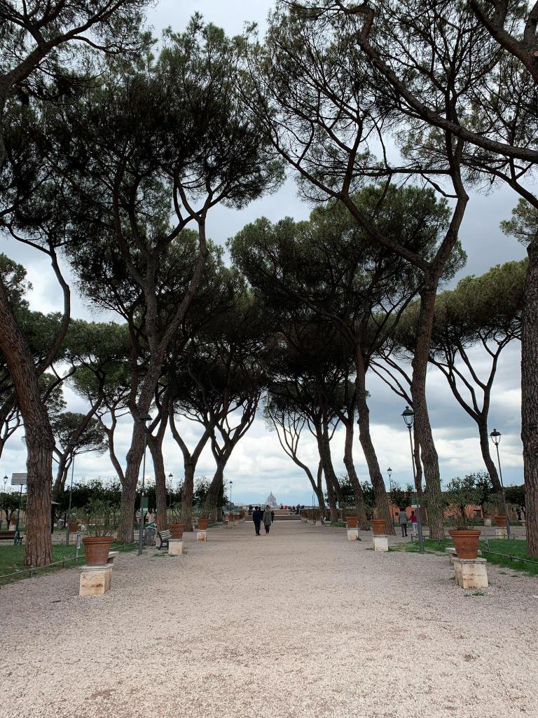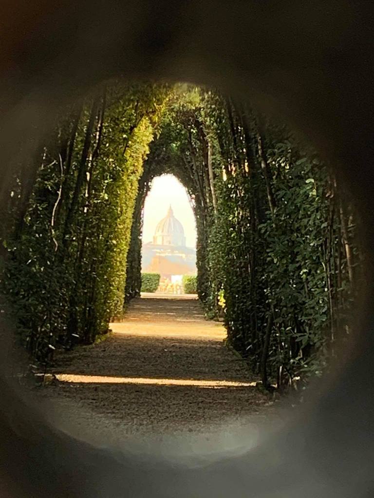 En partant de la Piazza Venezia, nous allons rejoindre pour cette journée, les lieux les plus bucoliques de Rome. D’abord rejoignons l’île Tibérine une petite île dans un méandre du Tibre, accueillant de nombreux édifices et monuments historiques et ensuite le Giardino degli Aranci ❤️. Juste à côté de celui-ci, on peut y voir le petit secret de Rome : « Le trou de serrure » (Buco della Serratura dell’Ordine di Malta) où l’on peut dans un parfait alignement saisir la coupole de la Basilique Saint-Pierre.