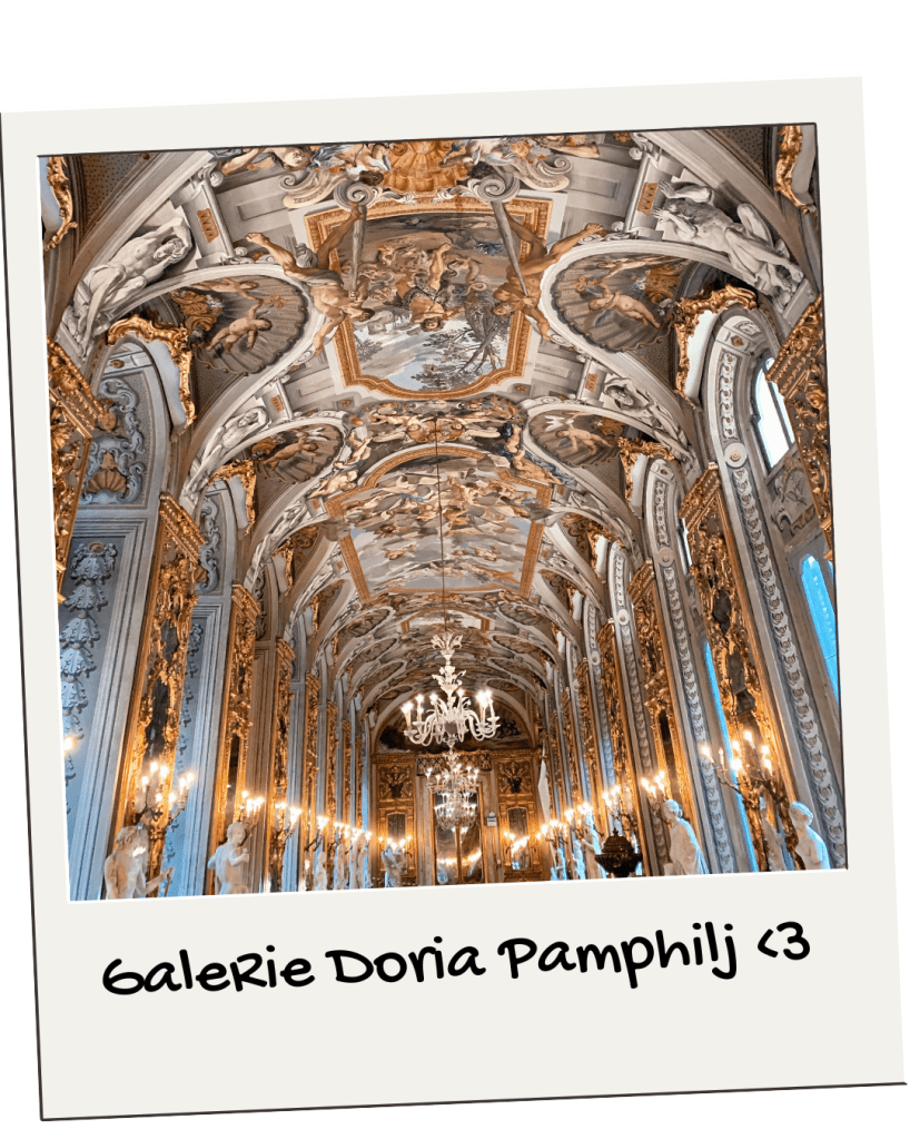 En se promenant dans les ruelles adjacentes, nous découvrons la Galleria Sciarria qui glorifie la femme dans le style Art nouveau. Et pour continuer dans l’Art, nous avons visiter la Galerie/Palais Doria Pamphili (1h) ❤️. Elle est souvent esquivée, mais avec l’audio-guide nous avons adoré en apprendre plus sur la famille a qui appartient ce palais. En outre la beauté du lieu est indéniable. Pour finir la journée en beauté, nous flânons aux alentours de la Piazza di Spagna, montons les escaliers de la place et finissons sur la Terrasse du Pincio ❤️ autre spot parfait pour le sunset! et qui donne directement sur l’immense Piazza del Poppolo.