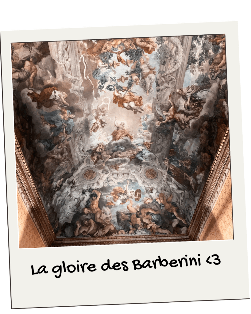- Nous avons fortement apprécié l’immense fresque trompe l’oeil (style 3D), racontant l’histoire du pouvoir de la puissante et ancienne famille Barberini.